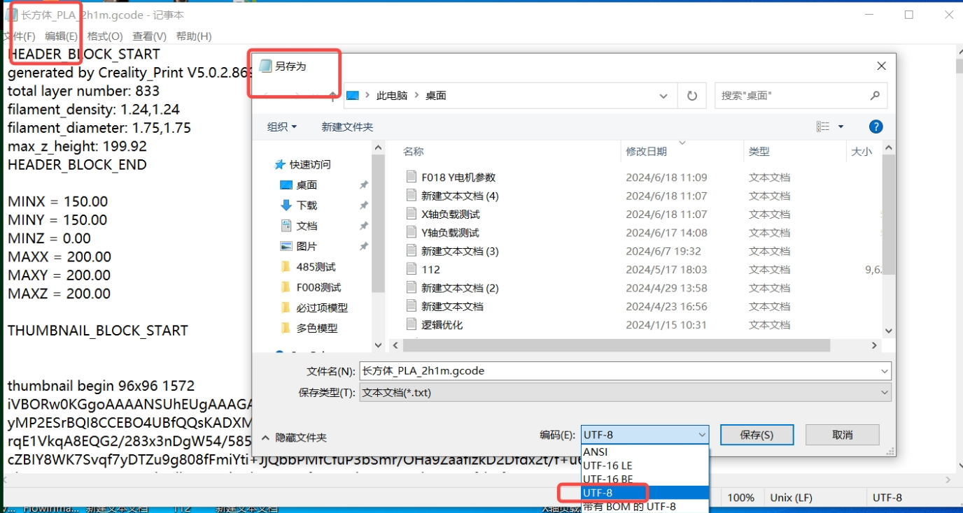 修改gcode时,注意使用UTF-8编码格式;如编码格式非UTF-8,可以使用记事本工具转换为UTF-8