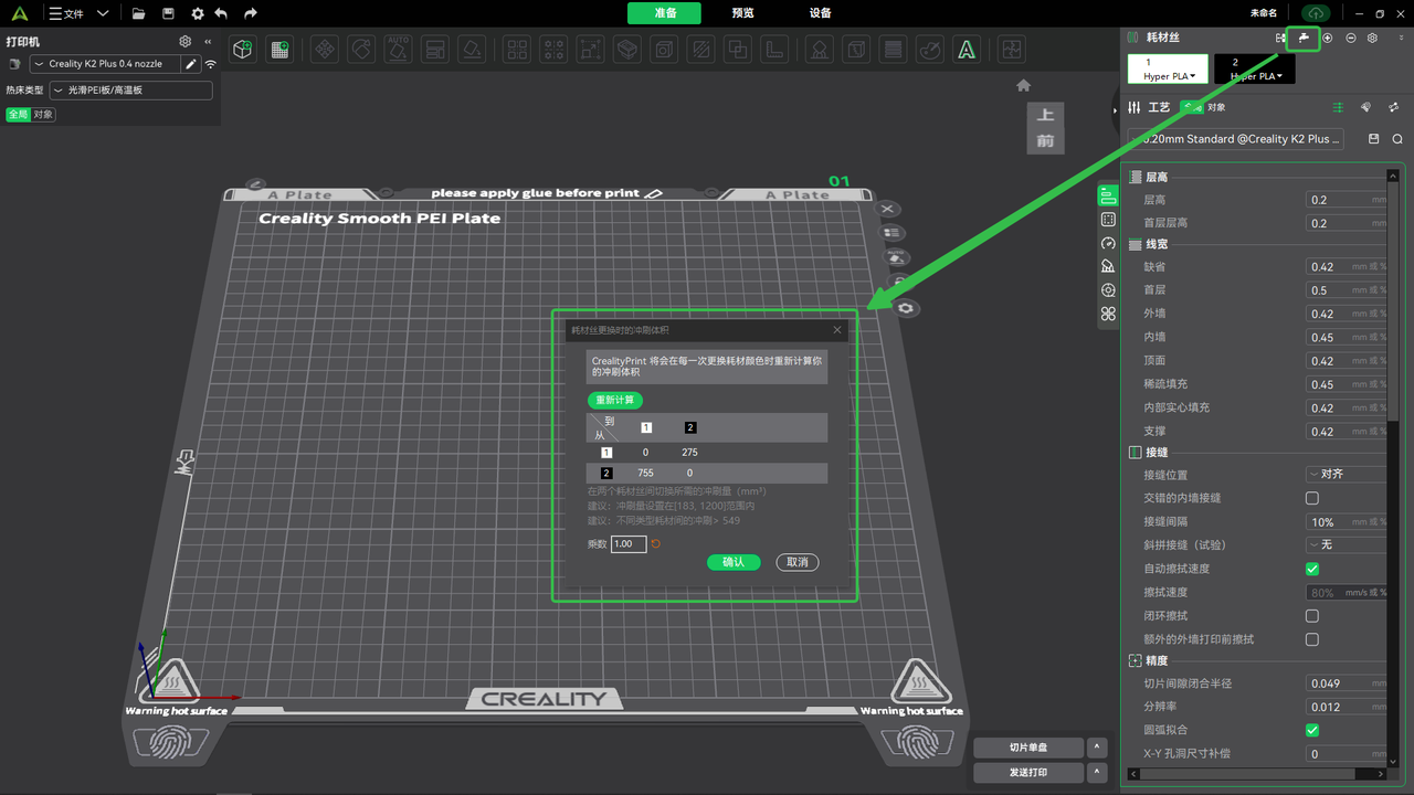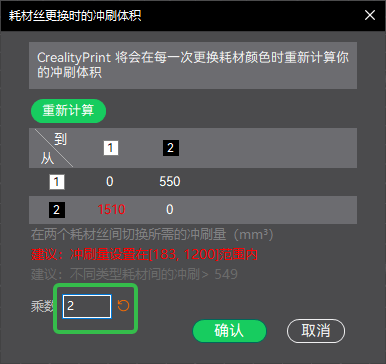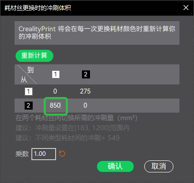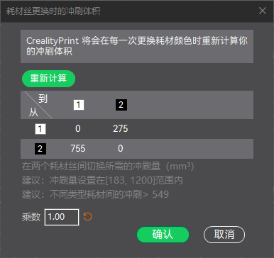 或者将冲刷系数增加,例如:冲刷系数为1时,白色耗材换料到黑色耗材的默认冲刷体积为275,将冲刷系数改为2时,白色耗材换料到黑色耗材的冲刷体积为275*2=550。同样地,修改完参数后需要点击确认才能生效。