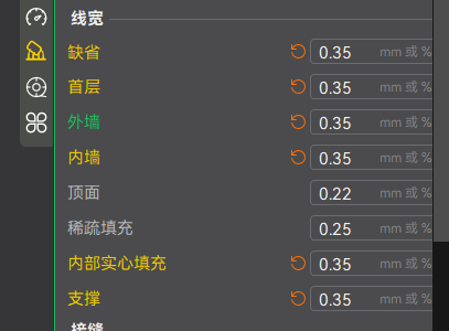 注意:使用 0.2mm 喷嘴进行 PLA/PETG 互相支撑打印时,建议参考下图增加线宽,以增加粘性,否则可能会导致炒面。此外,也可以使用修改器来修改支撑接触面附近的区域。