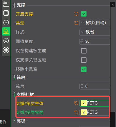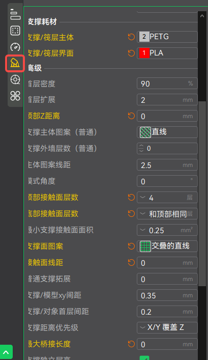 建议优先使用Generic Support for PLA作为支撑界面材料,通常不推荐使用PETG。如需使用PETG,可参考下文中进行设置,但打印效果可能不理想。