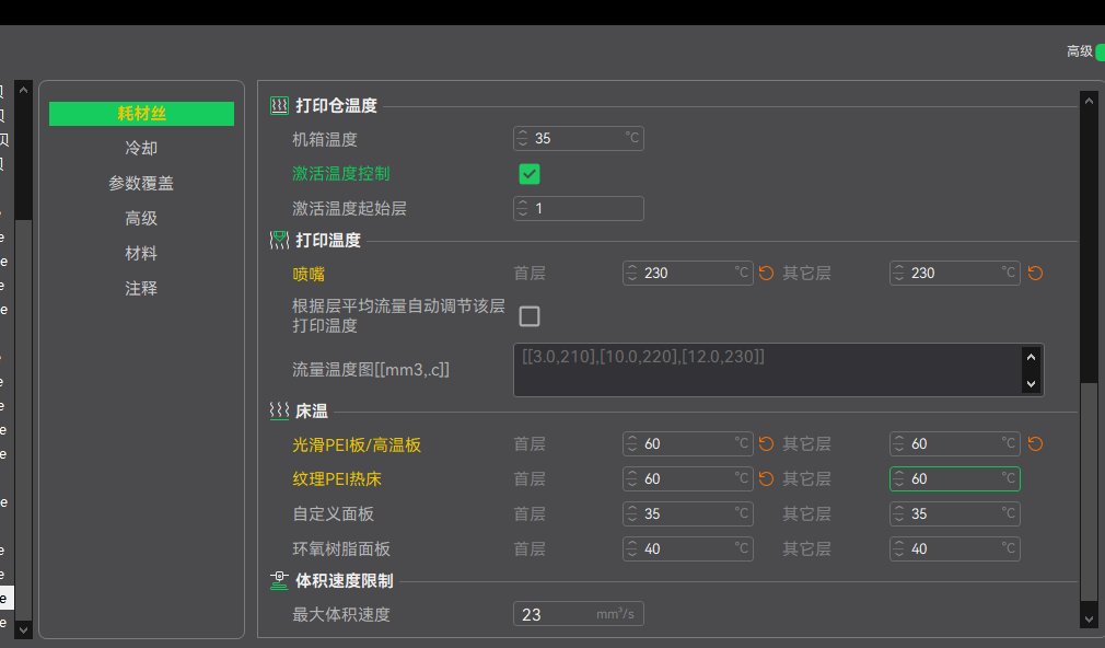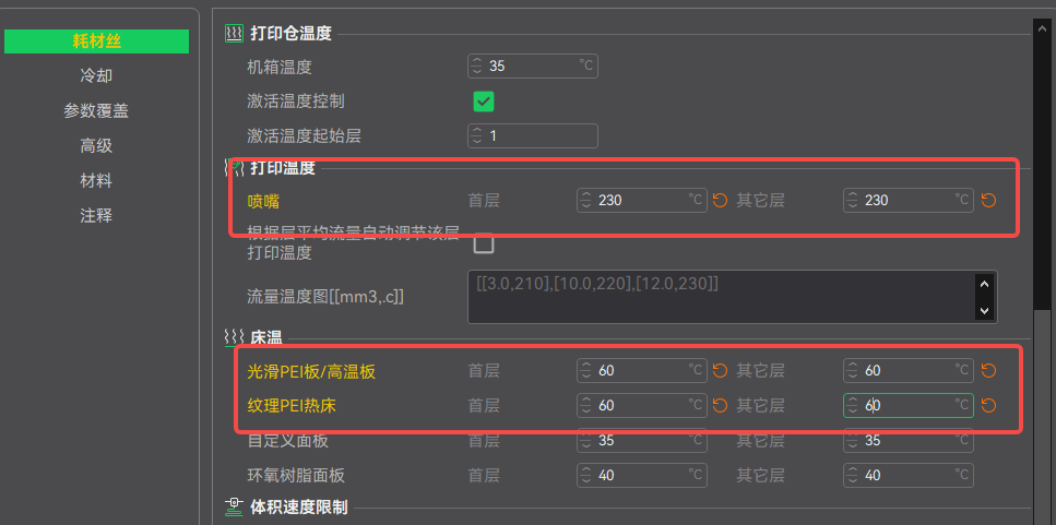 纹理 PEI 打印板:首层和其他层设置为 60°C。