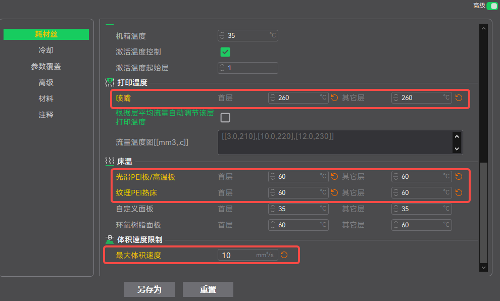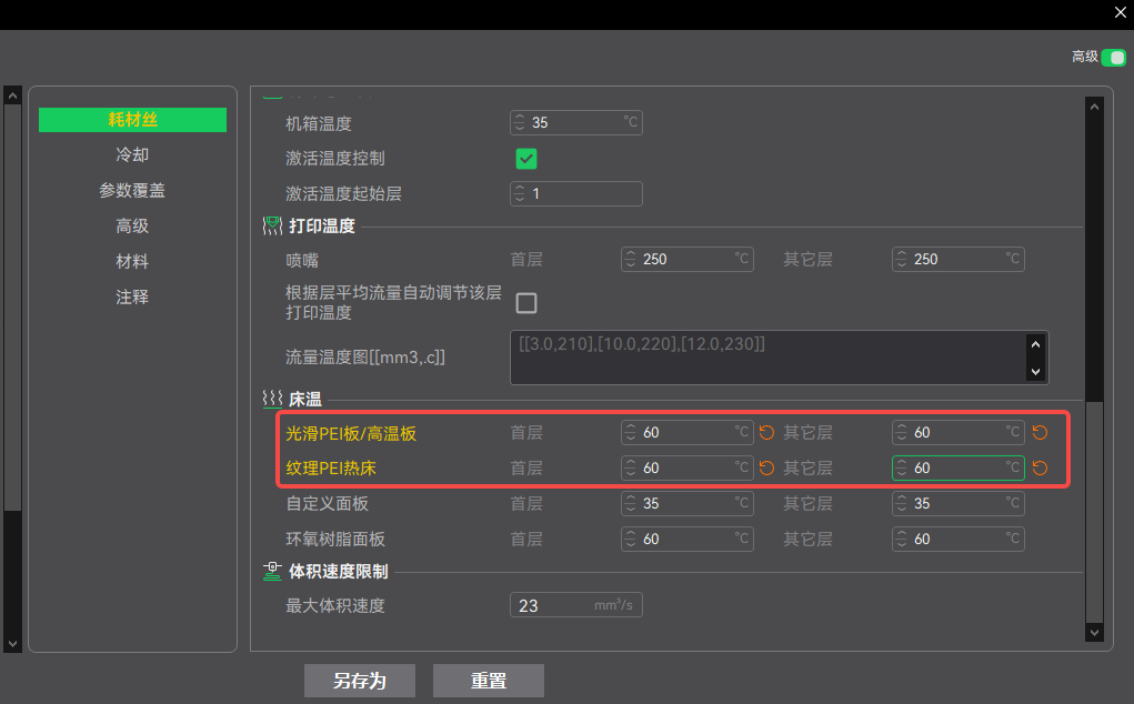 光面 PEI 打印板/高温打印板:首层和其他层设置为 60°C。