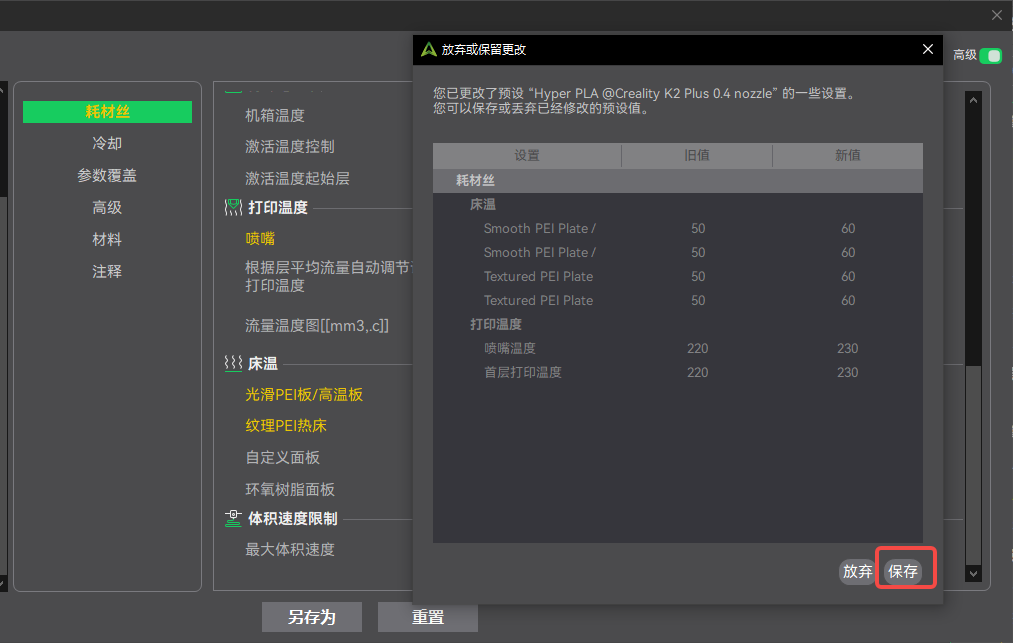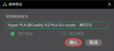 同理,修改完Hyper PETG的参数后,也建议保存预设,便于下次使用。