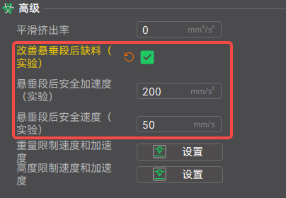在“工艺参数”-“速度”-“高级”下可开启“改善悬垂段后缺料(实验)”选项,目前推荐使用系统默认参数。