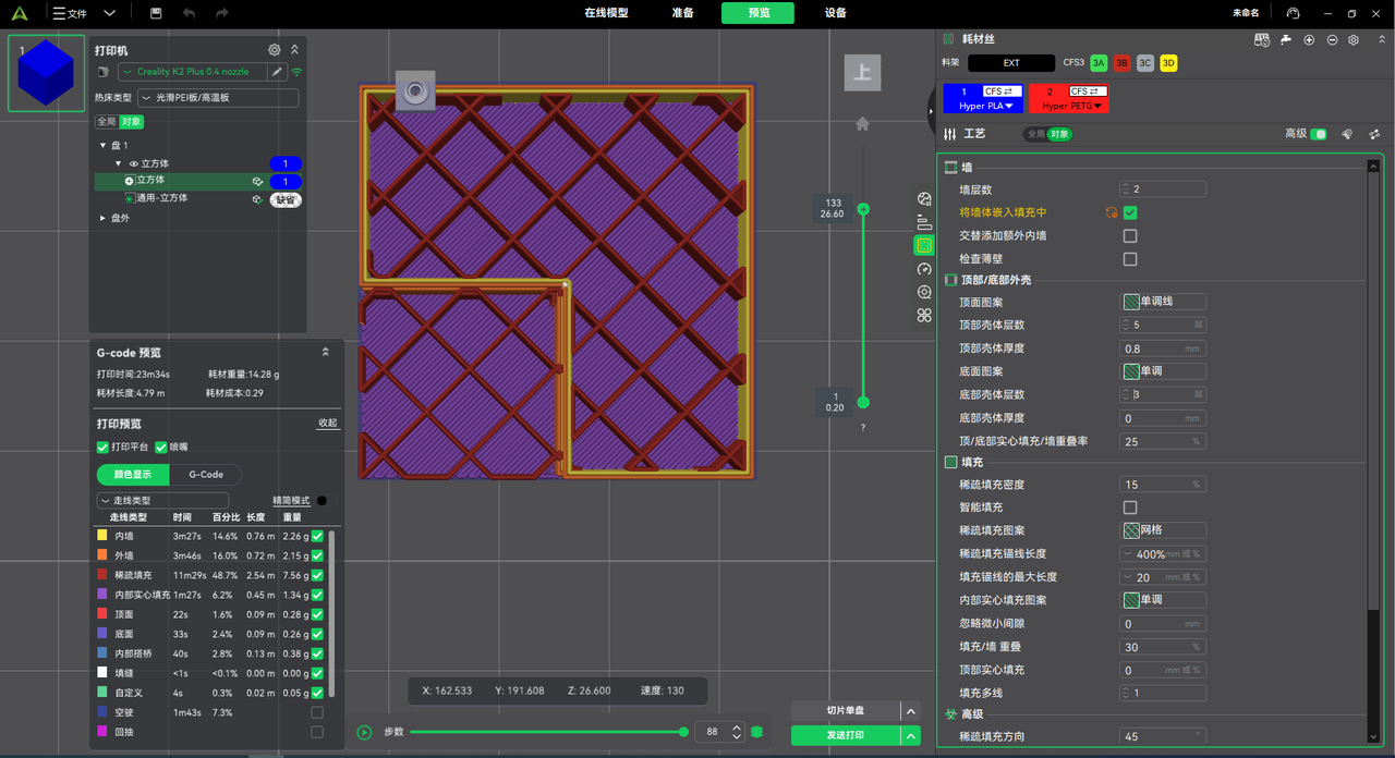 本次更新通过对PA值、平滑挤出率、制动速度、悬垂速度、融腔温度、缺料时间、加速度这七个参数进行引擎优化,改进了现有的算法。目前,在打印测试件的实验中,K2Plus、K2Pro、K1、i7,在相同的切片参数下,均有改善外观缺料情况。