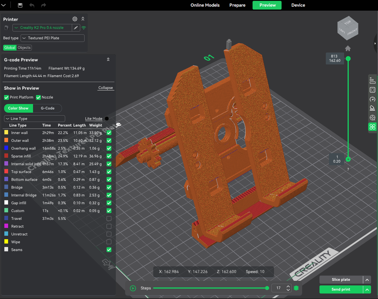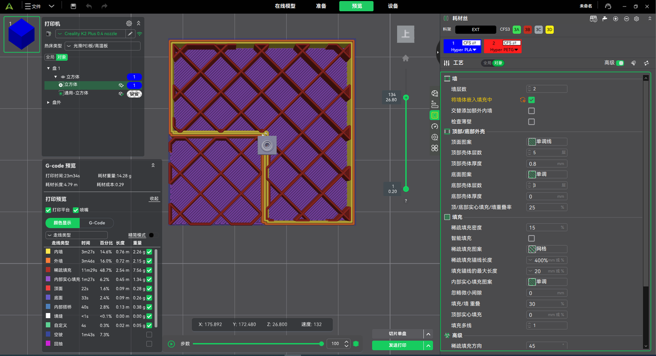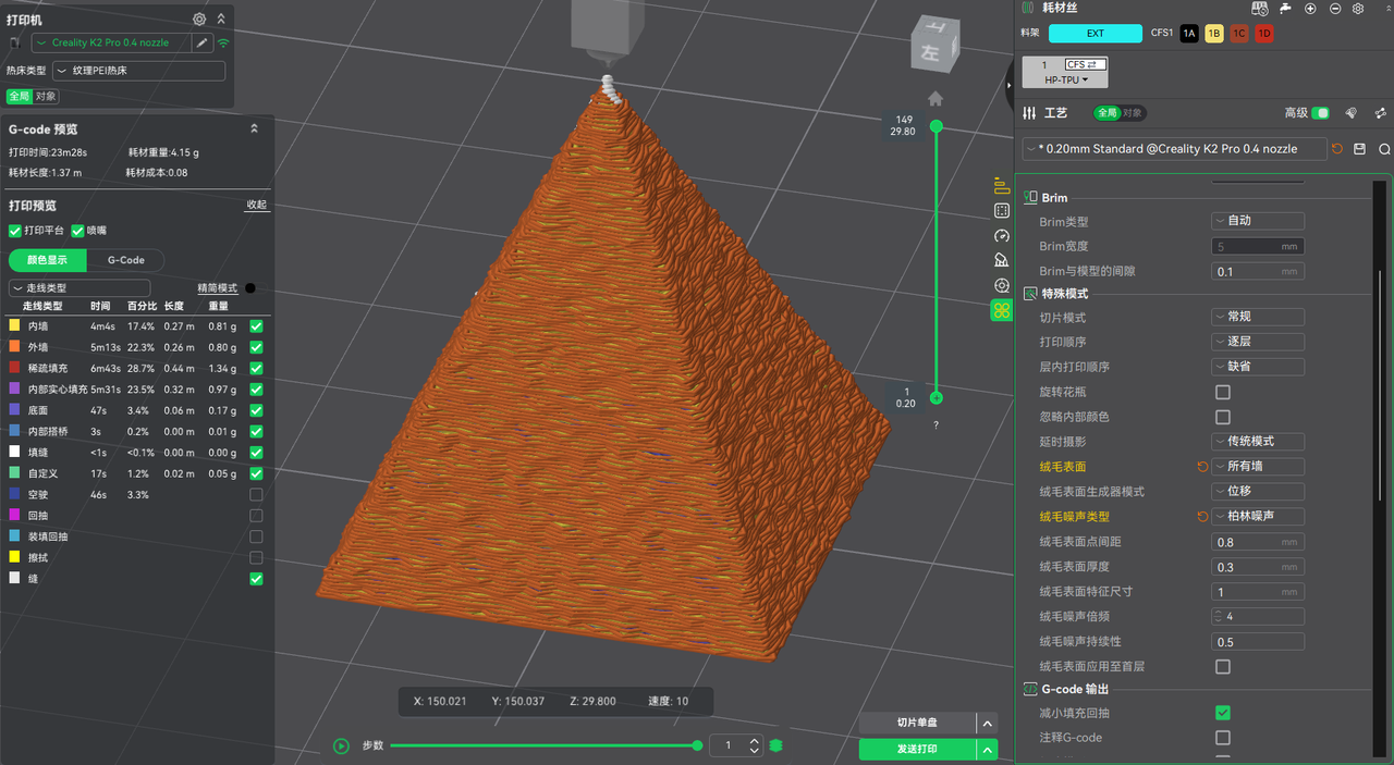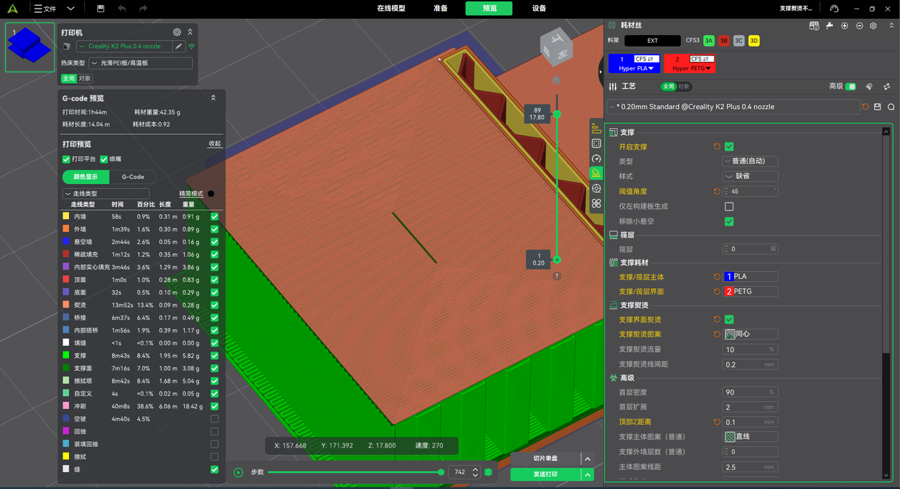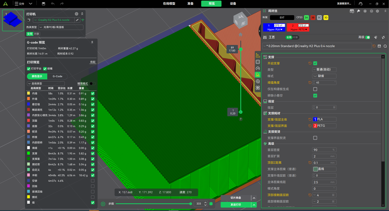 在我们的实测案例中,冲刷体积降低约 10%,实际耗材用量明显减少,且不影响打印质量与成品表现。