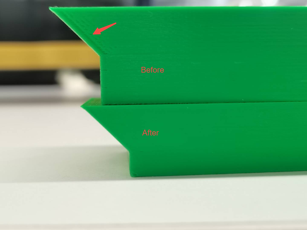 悬垂段结束后容易出现一条欠挤/缺料线基本属于FDM行业共性问题。这是因为悬垂区域通常会触发切片器的悬垂降速策略,随后速度/加速度快速回升,而热端熔体压力与实际挤出流量存在建立滞后,过渡位置就容易出现瞬时供料跟不上、形成缺料痕迹。