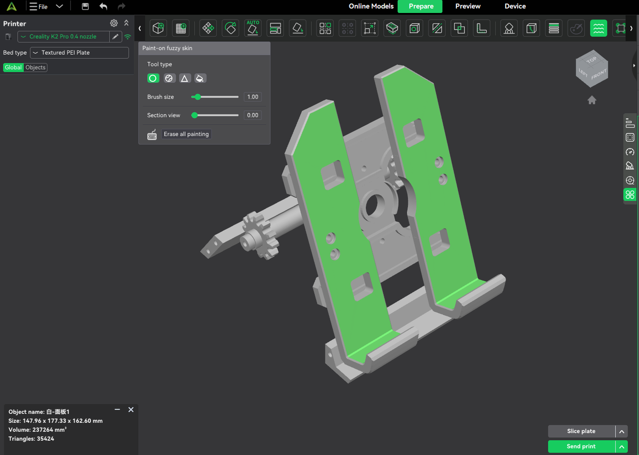 支持在模型表面自由绘制绒毛表面区域,实现局部纹理控制。无需全局启用,即可在指定区域增加防滑手感或打造磨砂质感,在提升外观表现的同时有效隐藏层纹,兼顾美观与实用性