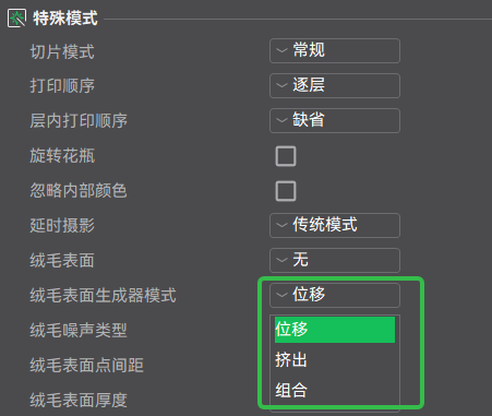 新增多种表面生成模式与噪声类型,支持位移(Displacement)、挤出(Extrusion)与组合(Combined)三种生成方式,满足不同结构与质感需求。同时引入柏林噪声(Perlin)、云状噪声(Billow)等多种纹理算法,带来更加丰富且自然的表面效果,实现从细腻磨砂到复杂有机纹理的自由表达。感谢@SoftFever的贡献。