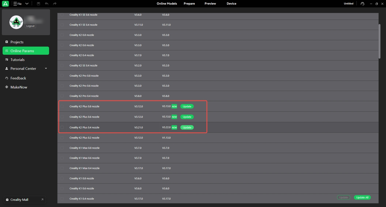 1. 云参数包:首页 => 在线资源 => 在线参数 更新到最新(此处以K2 plus为例)