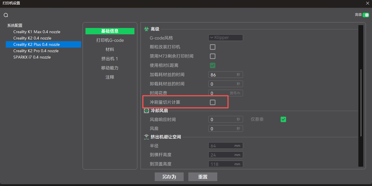 2. 打开打印机设置 => 基础信息 => 勾选冲刷量切片计算。保存设置后切片即可使用。