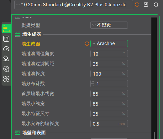 当模型因导出精度问题,表面略微不平整时,使用Arachne墙就可能会尽量还原不平整的表面细节,如果希望能生成光滑的表面则可以尝试使用经典墙。