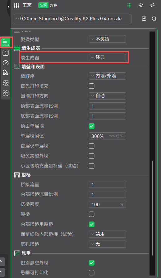 经典墙会按照所设置的线宽沿着模型表面生成固定线宽的路径,这种墙生成方式不会改变墙的宽度,适用于大多数模型快速切片。