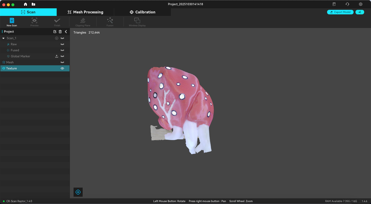 注意:框架点导出再导入无法贴图,需新建Scan重新扫描