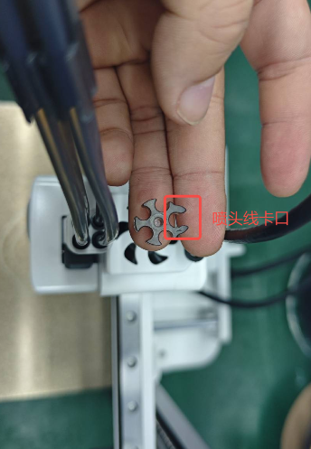 安装五口集线器;观察集线器,将较长的卡口朝后,其余四口安装料管,将喷头线卡入较长的卡口。
