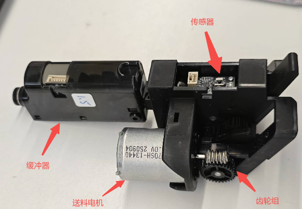送料器在靠近进料口处,设置了一个耗材检测传感器,当耗材被从进料口插入后,耗材检测传感器触发,电机启动并让送料齿轮咬住耗材,自动将耗材送入;