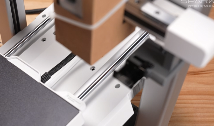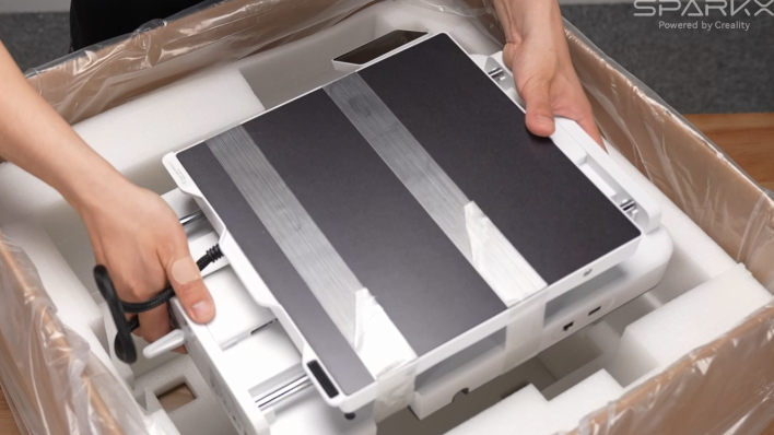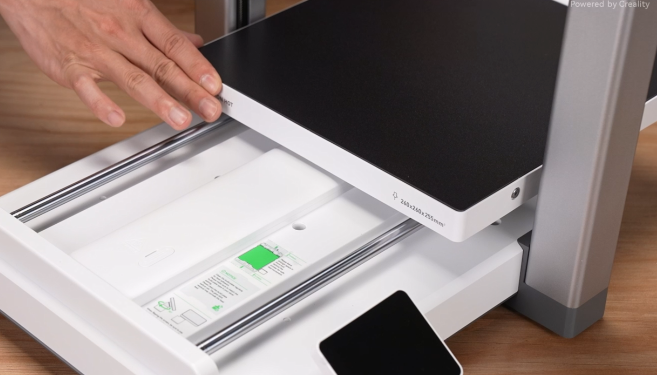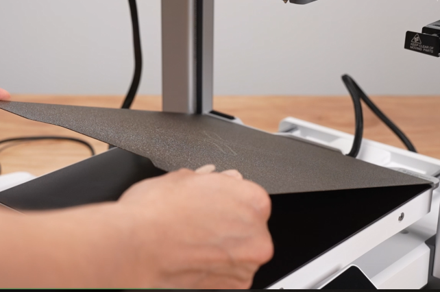 取出包装内的PEI金色双面打印平台板,对准热床上的凹槽放置