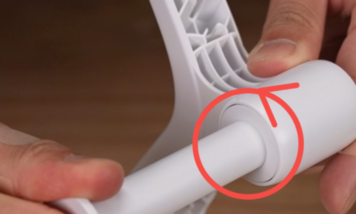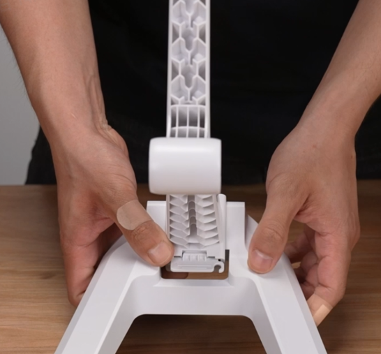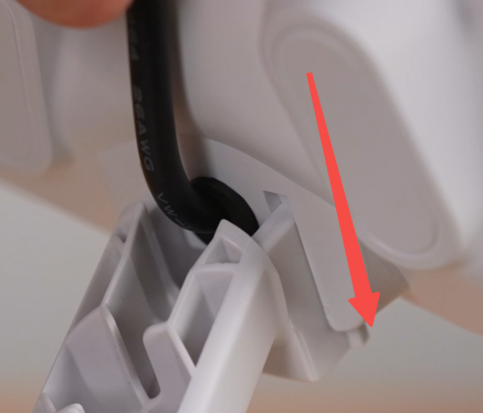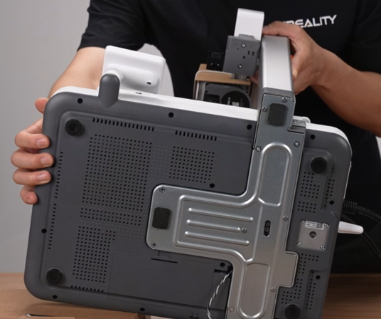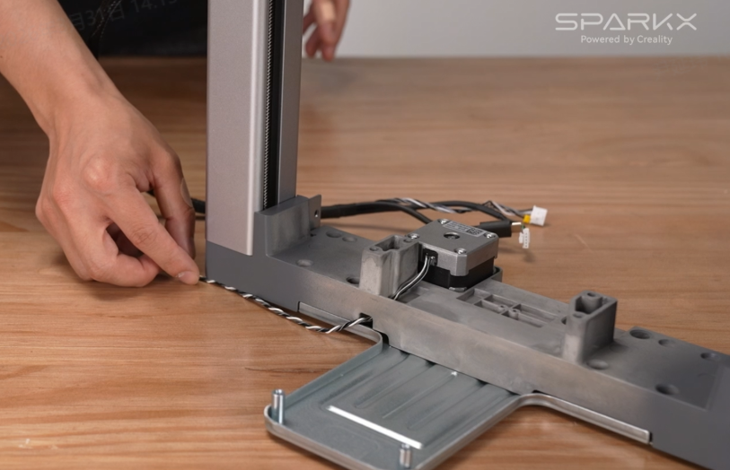 将龙门架直立摆放在桌面上,注意将底部线缆拨到一旁,以免安装底座时压住线缆;
