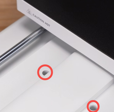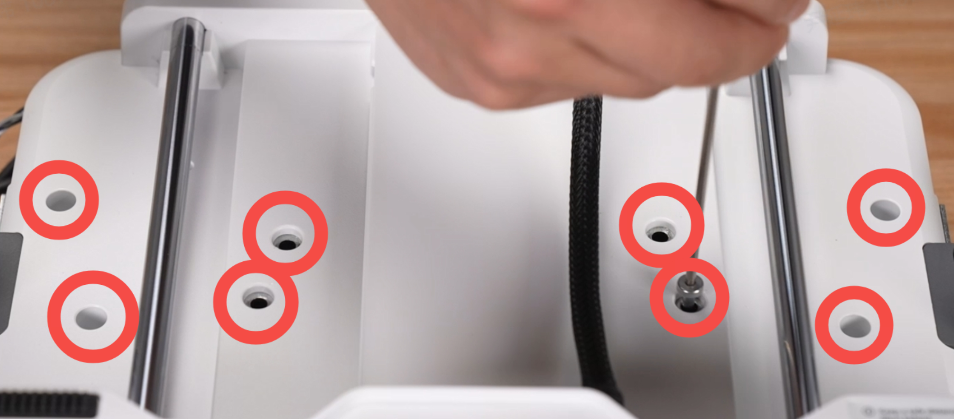 将热床移动至机器前端,使用H2.5内六角扳手将较长的螺丝安装在如图所示八个螺丝孔;再将热床移动至后方,安装剩余两颗螺丝;