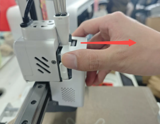 切刀安装在挤出机的左侧位置,当工具头移动至最左侧时,切刀杆会通过杠杆作用挤压内部的切刀,以切断耗材;耗材切断后,切刀会在内置磁铁的磁力作用下回到原位。