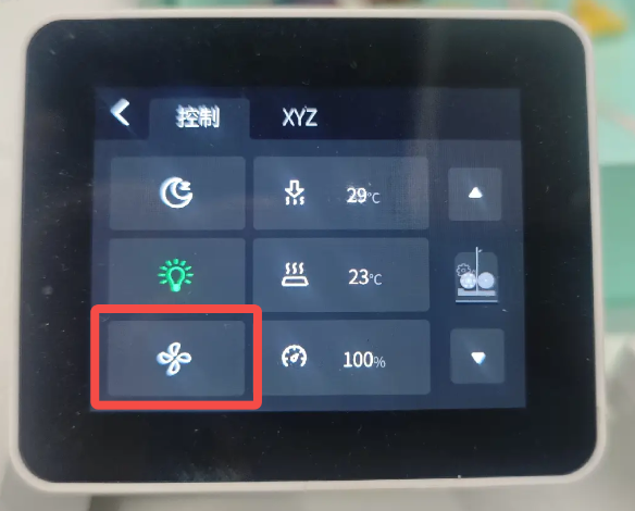 在机器端屏幕进入设备控制页面,点击模型风扇
