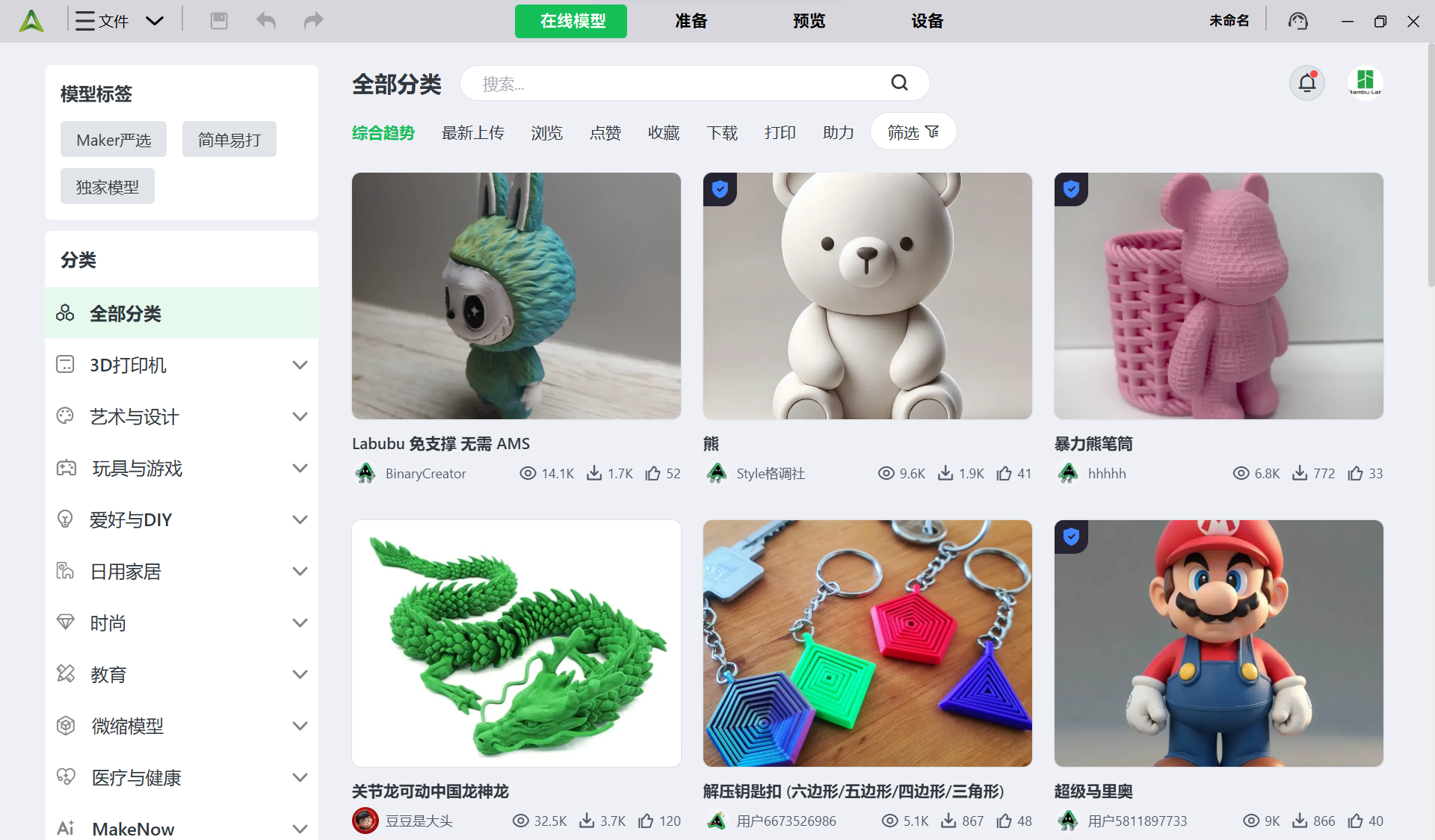 选择或导入想要打印的模型,在左上角选择你要使用的打印机型号,点击右下角的切片单盘,等待切片完成后再点击发送打印