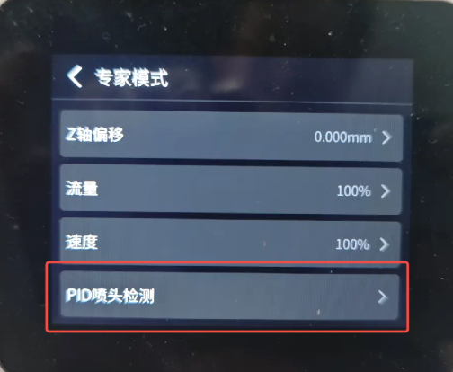 PID 校准选项位于“设置 - 打印设置(第二页)- 专家模式”,找到“PID 喷头检测”。