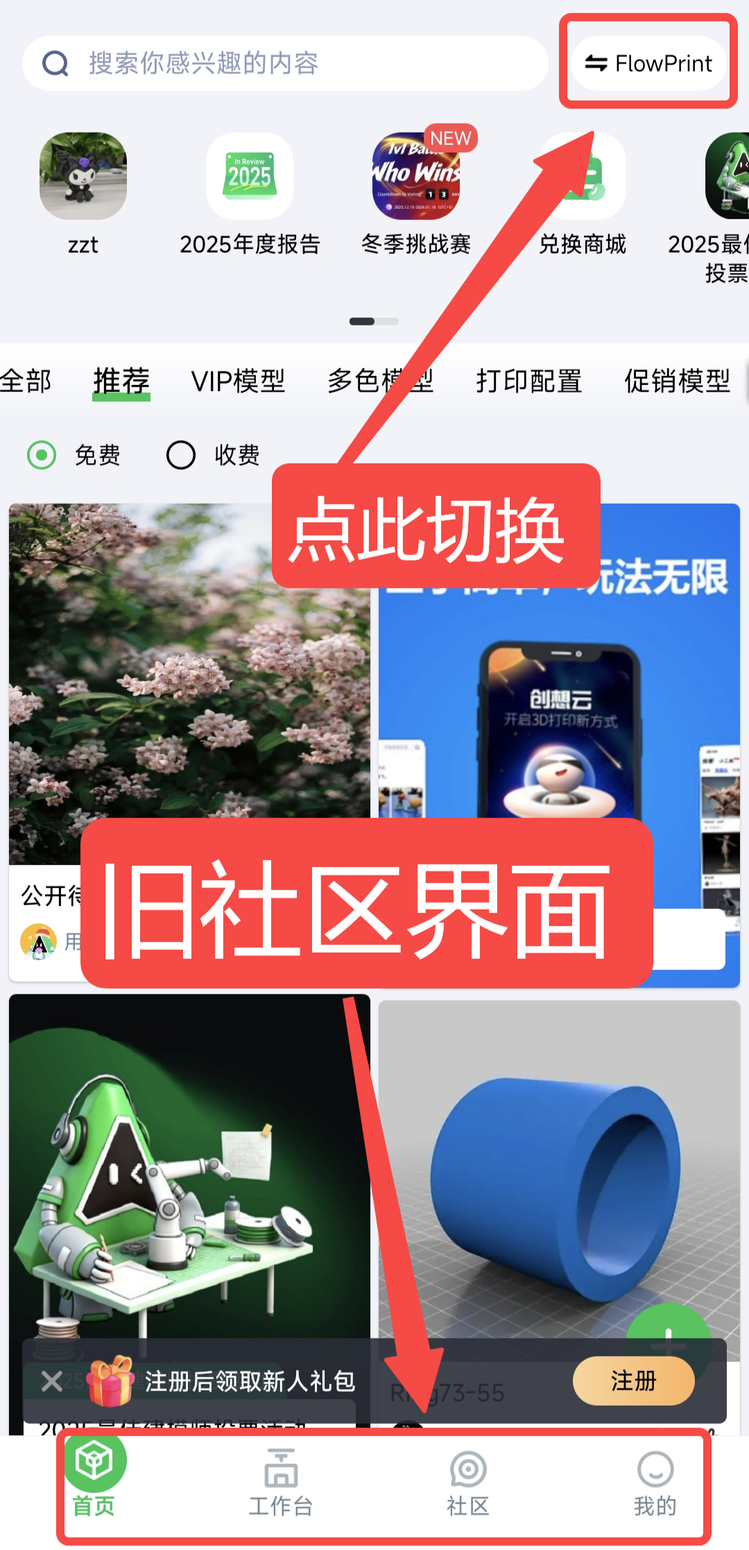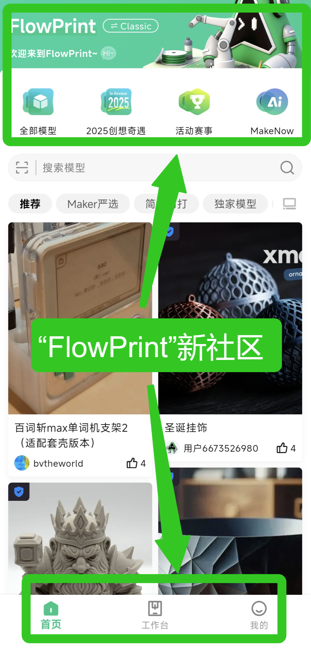 在“FlowPrint”社区界面切换到工作台,点击右上角的“+号”