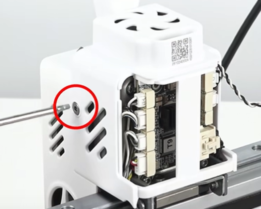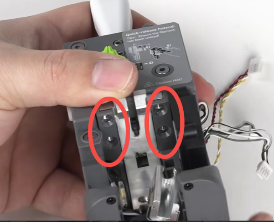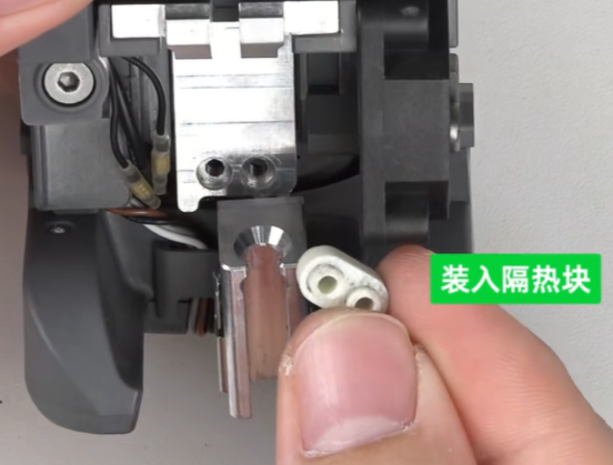 将隔热块、热端加热组件安装回原位,并拧紧背部两颗固定螺丝,再将固定螺丝反向拧松半圈