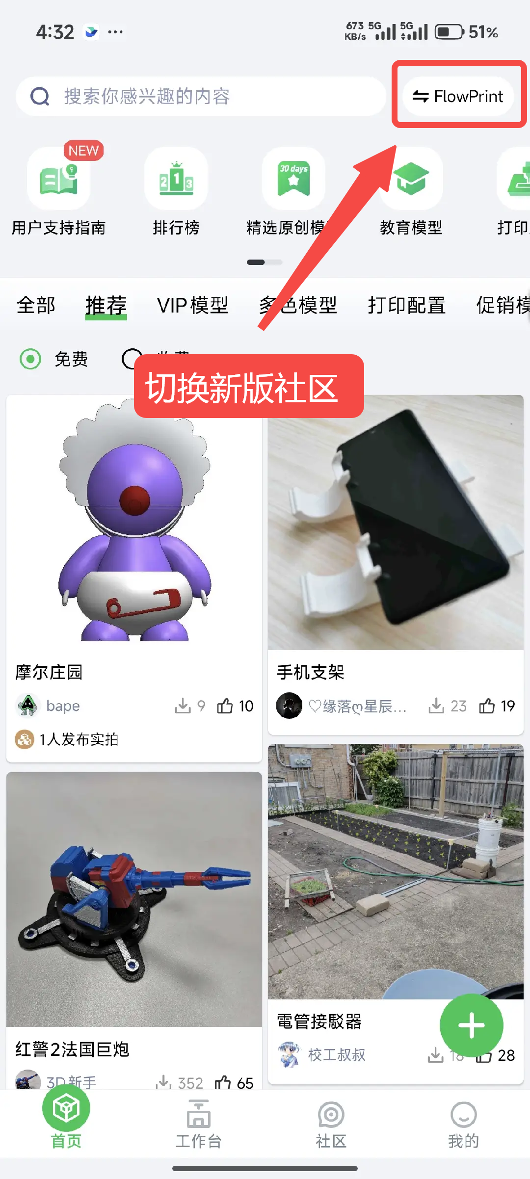 若您进入APP后在旧版社区,可点击右上角进入FlowPrint